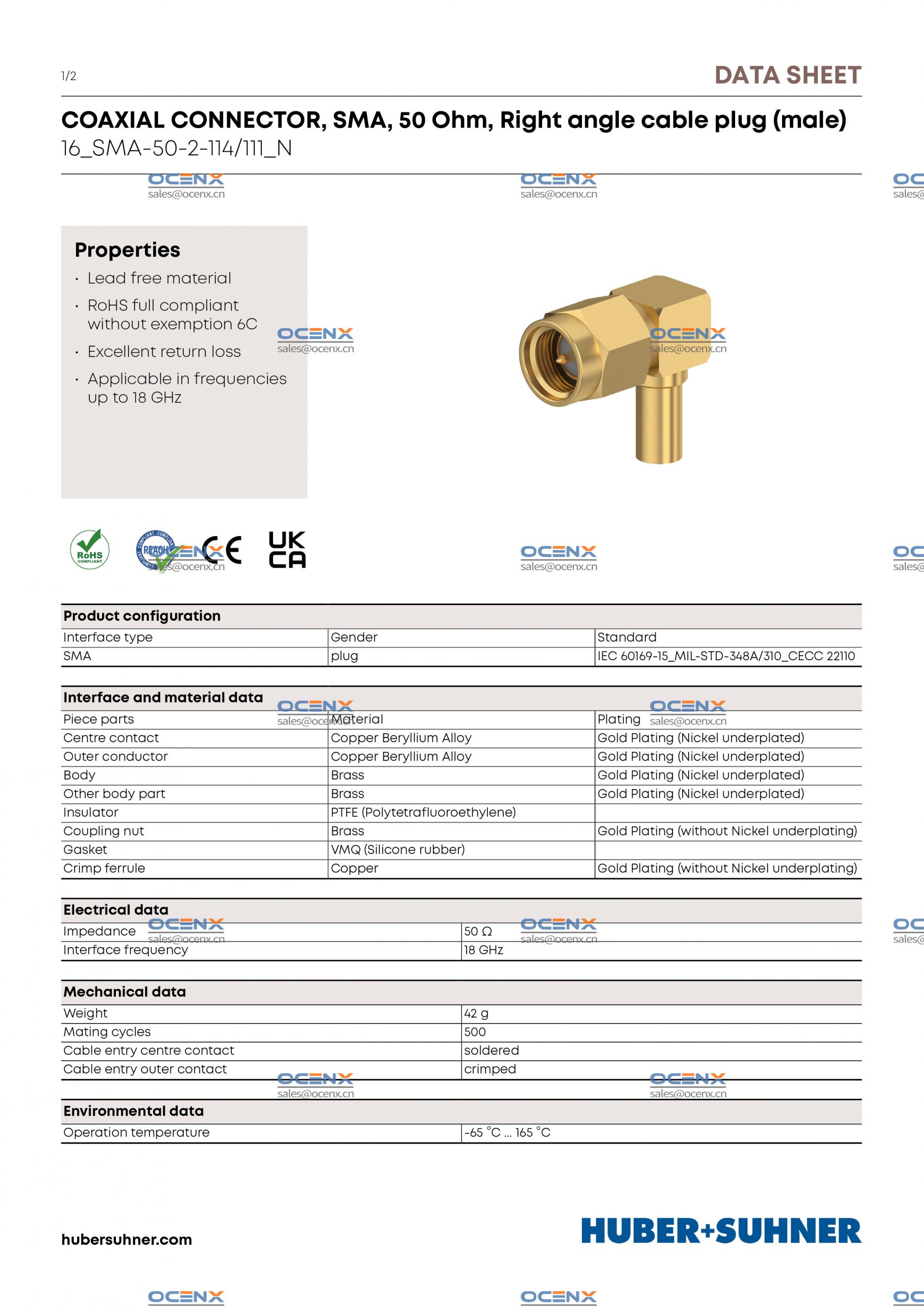 HUBER+SUHNER COAXIAL CONNECTOR, SMA, 50 Ohm, 18 GHz, Right angle cable plug (male). Suitable cables: RG_316_/U, RG_174_/U, GX_02272