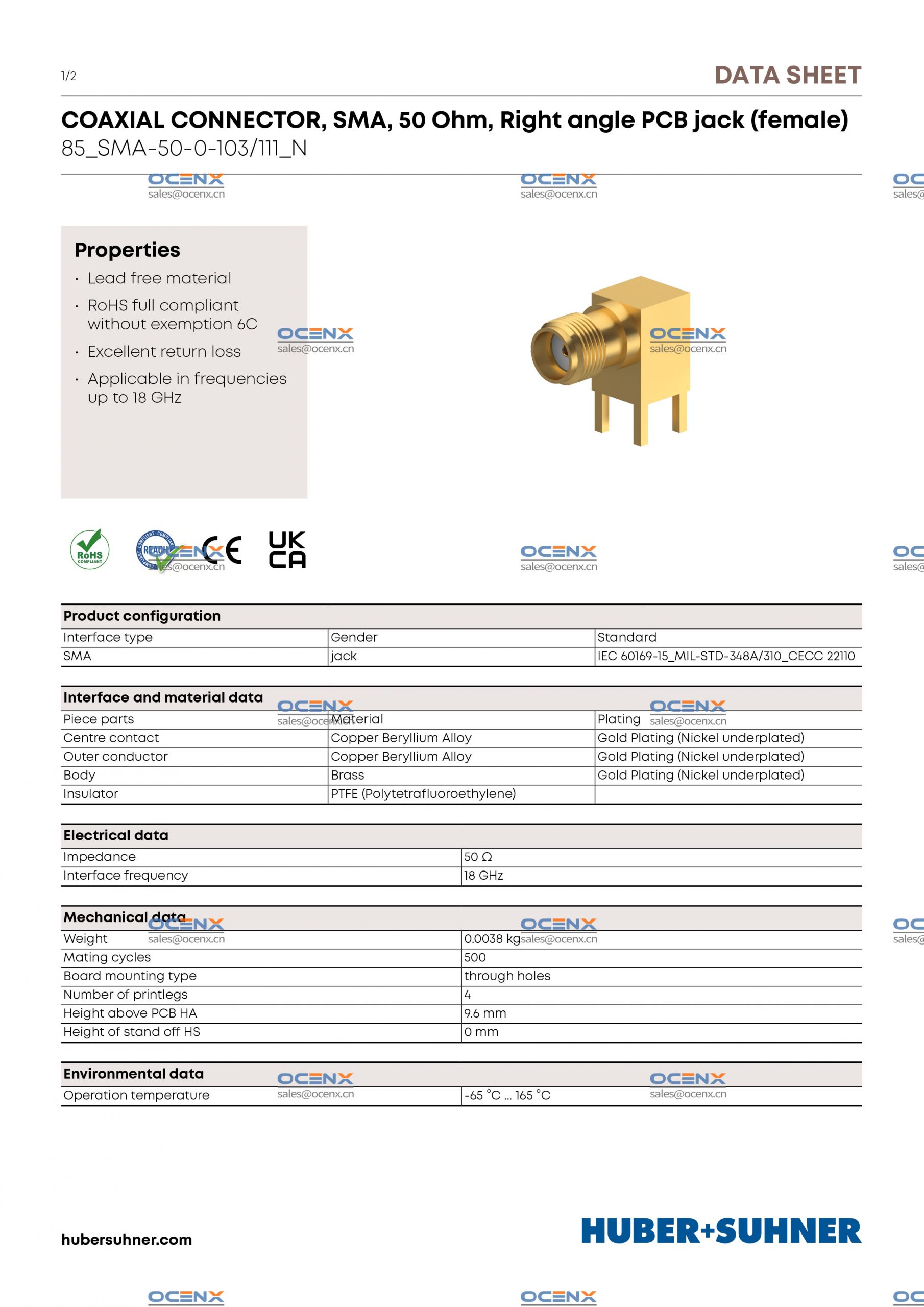 HUBER+SUHNER COAXIAL CONNECTOR, SMA, 50 Ohm, 18 GHz, Right angle PCB jack (female)