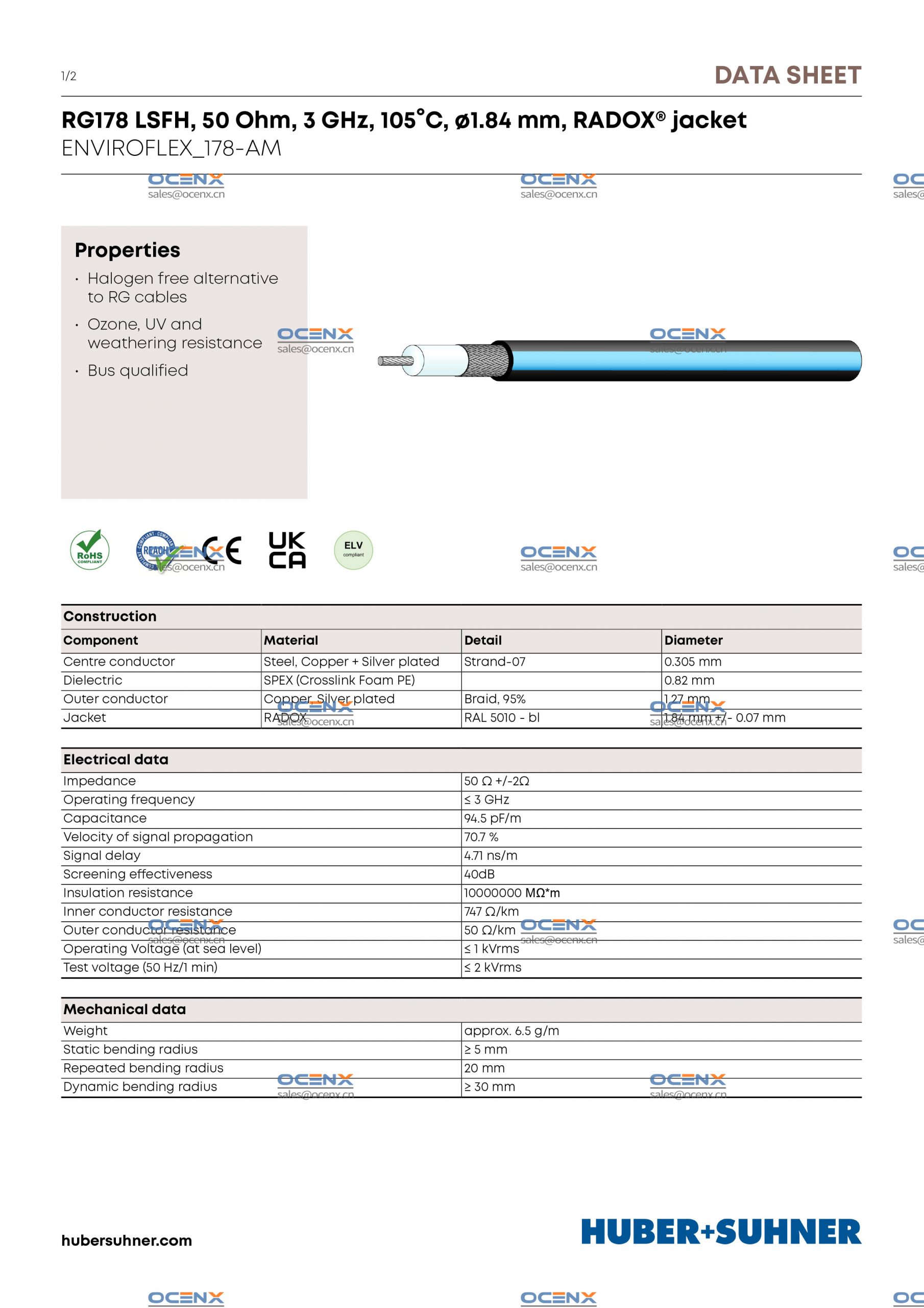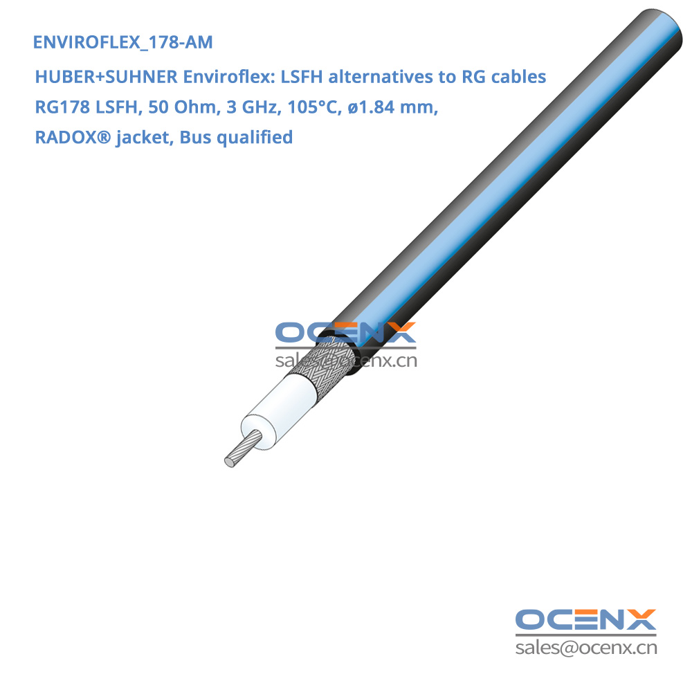 HUBER+SUHNER RG178 LSFH, 50 Ohm, 3 GHz, 105°C, ø1.84 mm, RADOX® jacket, Bus qualified