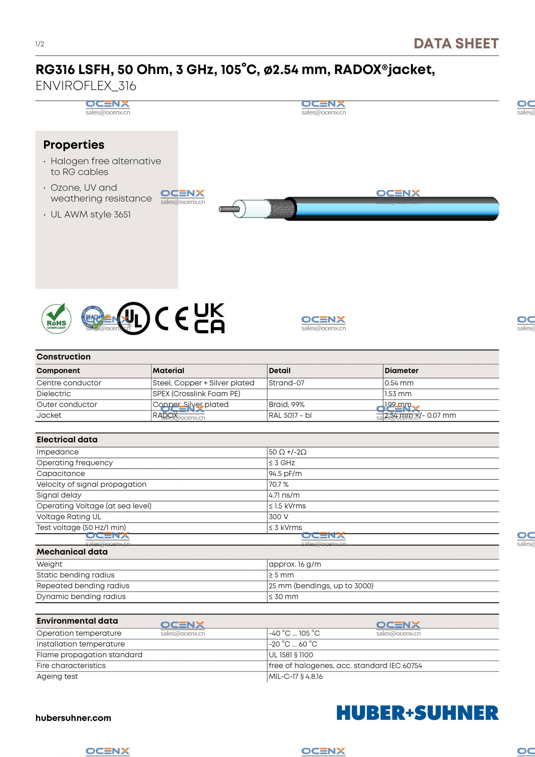 HUBER+SUHNER RG316 LSFH, 50 Ohm, 3 GHz, 105°C, ø2.54 mm, RADOX® jacket, Flame retardant, UL AWM style 3651